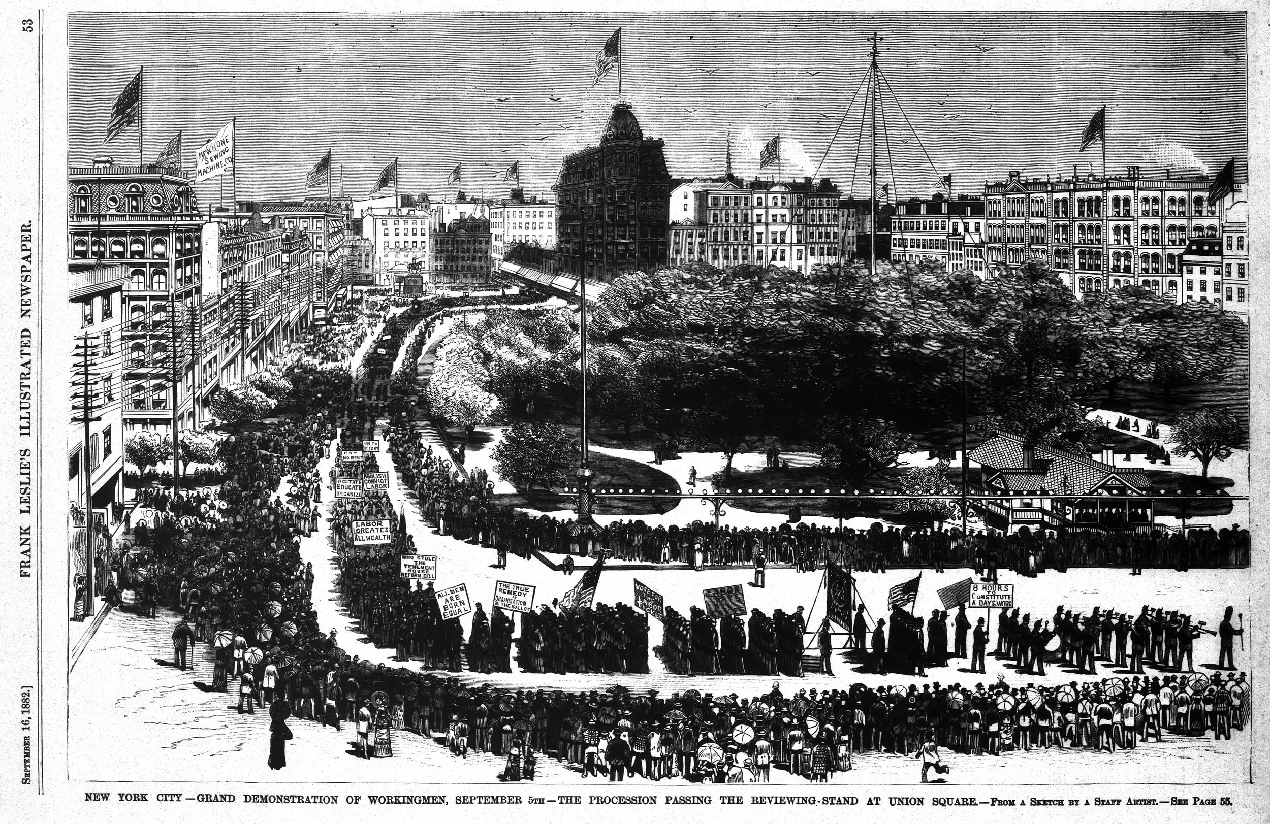 Illustration of the first American Labor parade held in New York City on September 5, 1882 as it appeared in the September 16, 1882 issue of Frank Leslie's Illustrated Newspaper via Wikimedia Commons