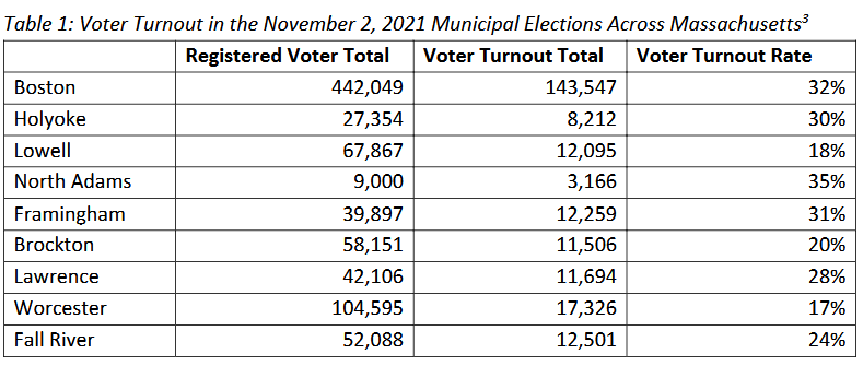 While voters may not believe that local elections matter all that much, the opposite is actually true. Of all elections, local [elections] have by far the greatest impact on the day-to-day lives of residents. Local officials, like mayors, city councilors, and school committee members, decide the types of policies that residents live with every day, such as policing, affordable housing, and education. These officials do not offer vague platitudes on these subjects, but make decisions that actually impact residents. They consider how much funding the police department should receive, how many public housing units should be built, and what direction schools should move in. These officials do more than fill potholes and repair streetlights. They shape the lives of each resident, from young students to retirees to everyone in between. (page 3 of report)