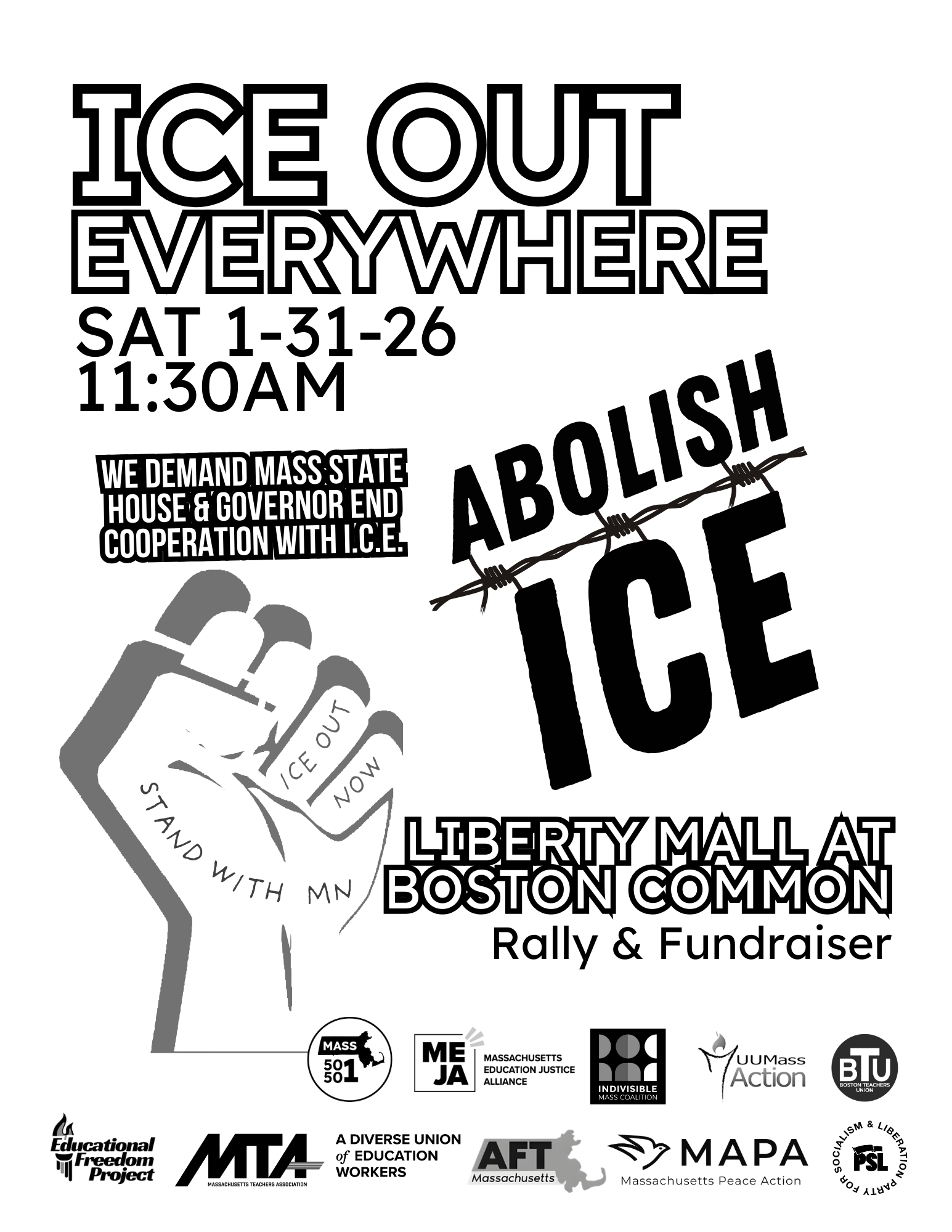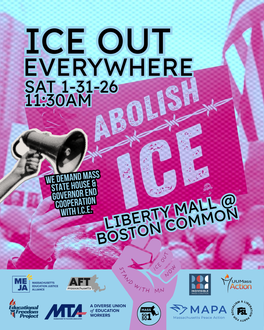 Join Mass 50501, UU Mass Action, Indivisible Mass Coalition, PSL, MEJA, and many more as we come together to: